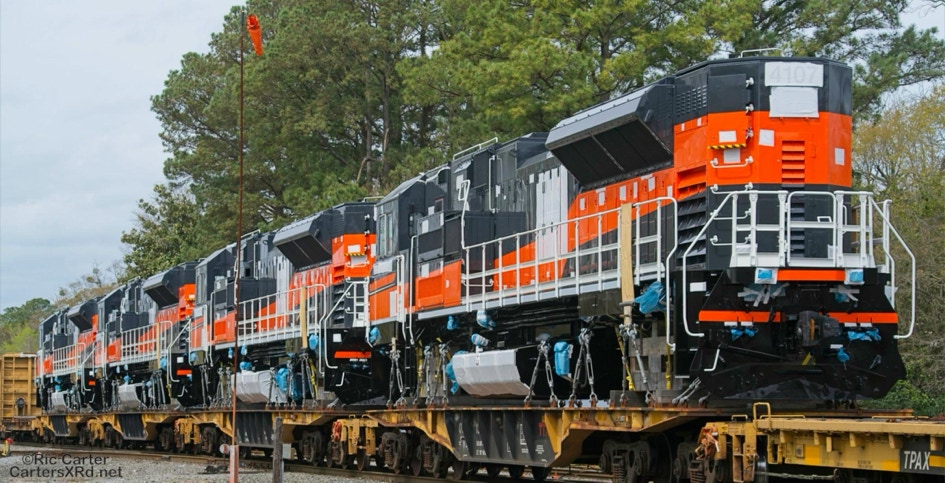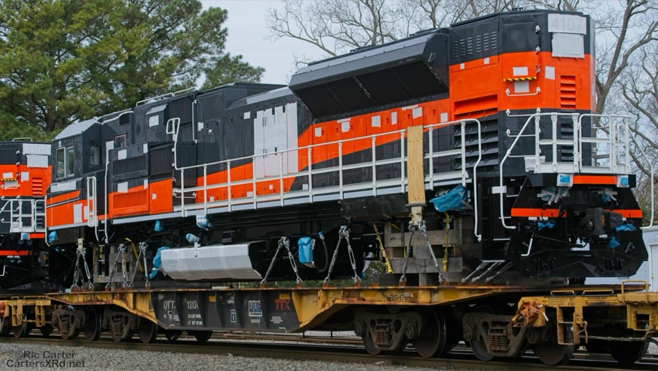 All EMD locomotive exports leave through the NC Port of Morehead City in March. These SD70ACe/LW units are headed for Mongolia. These phots were taken as they passed through New Bern NC.Four different units shipped just a couple of months ago to Chile. I find the differences in American and international cab design preferences interesting.