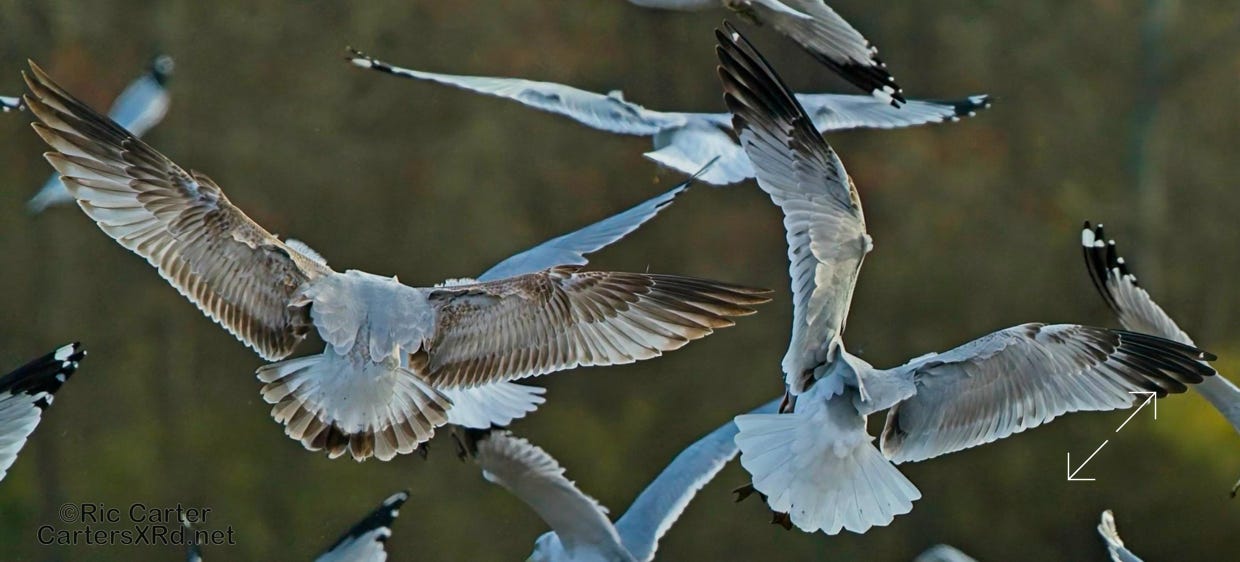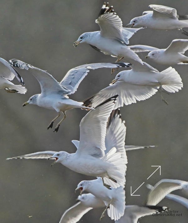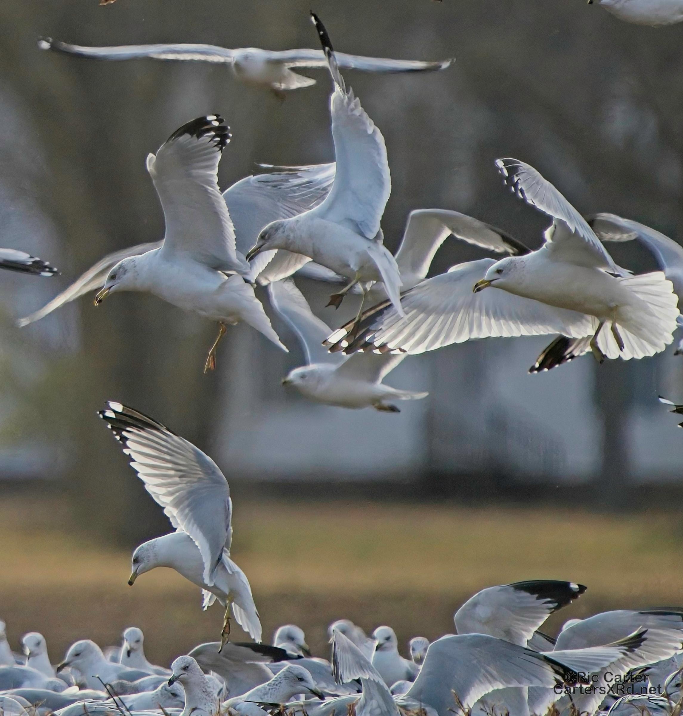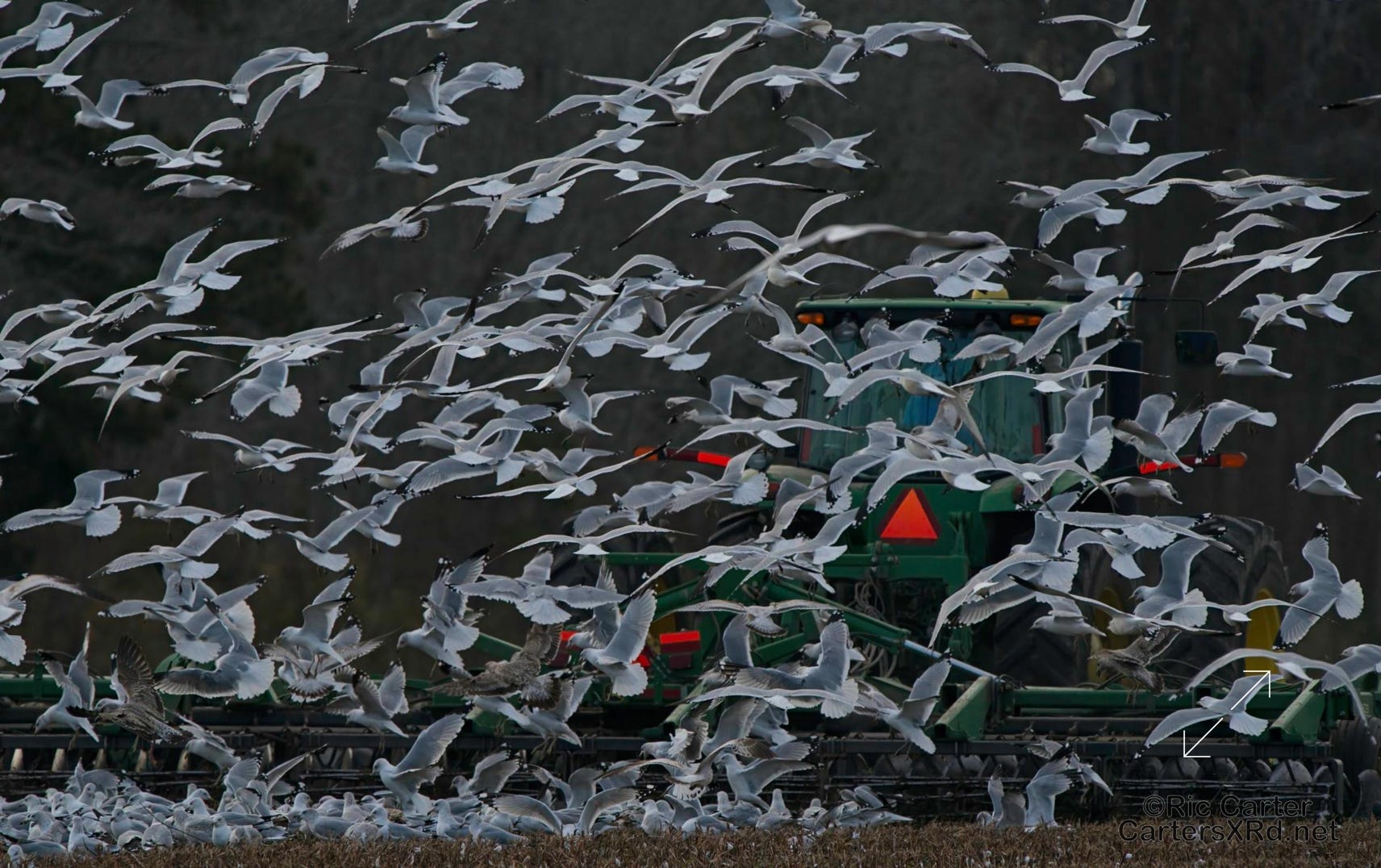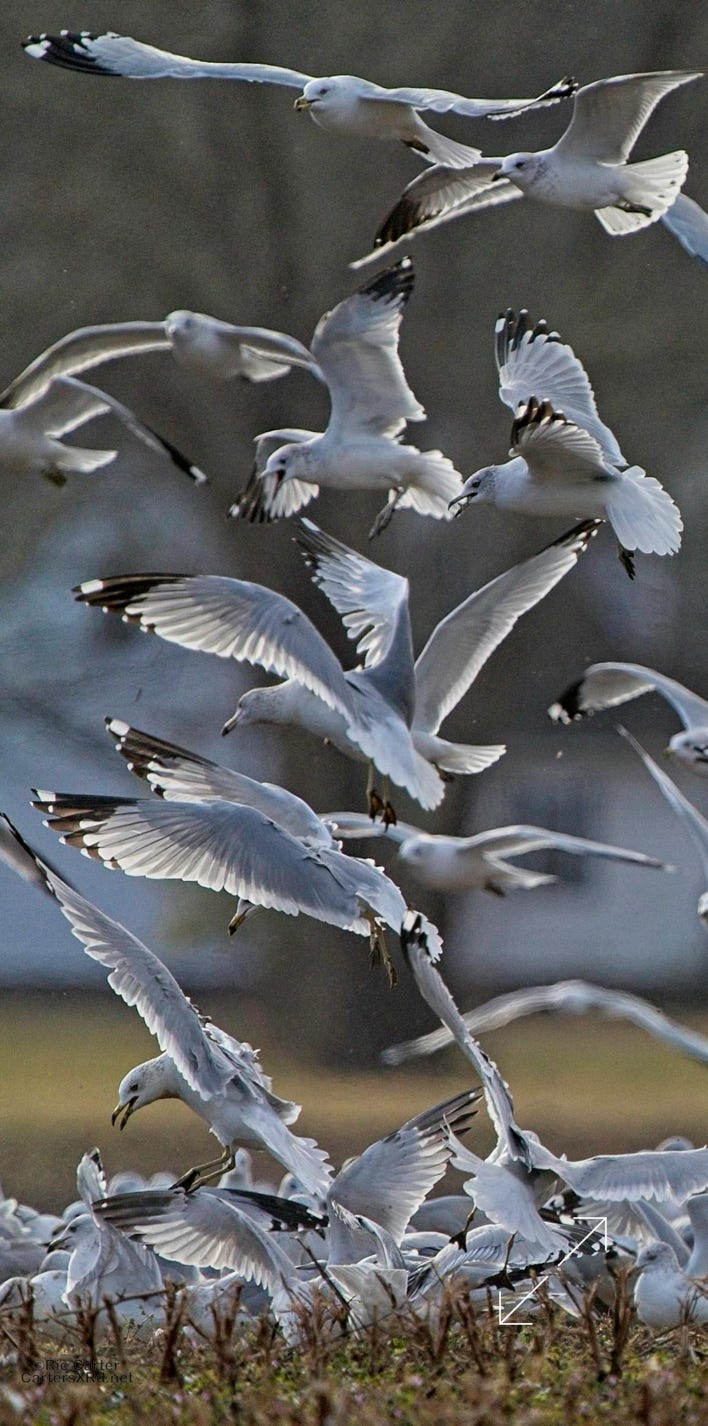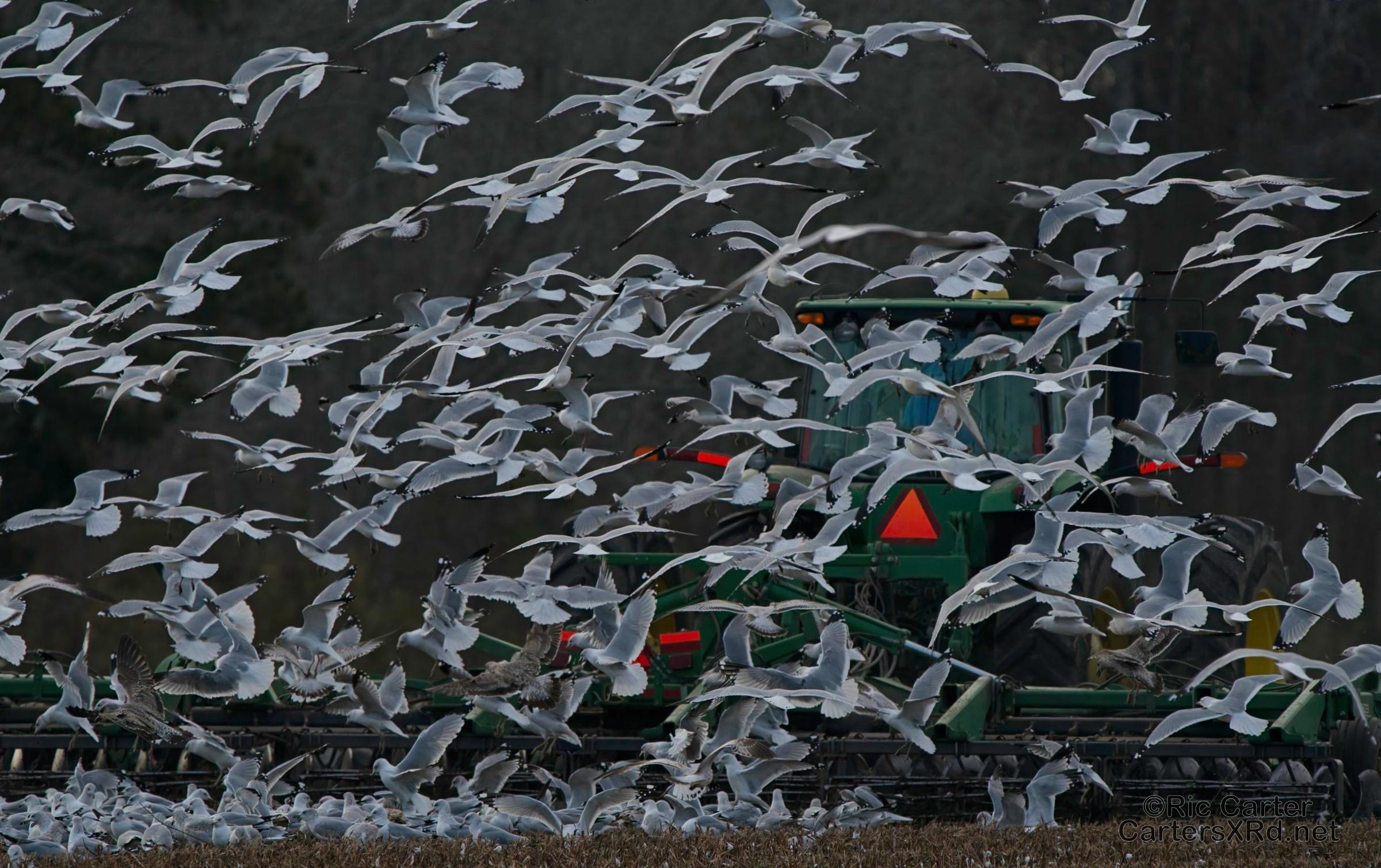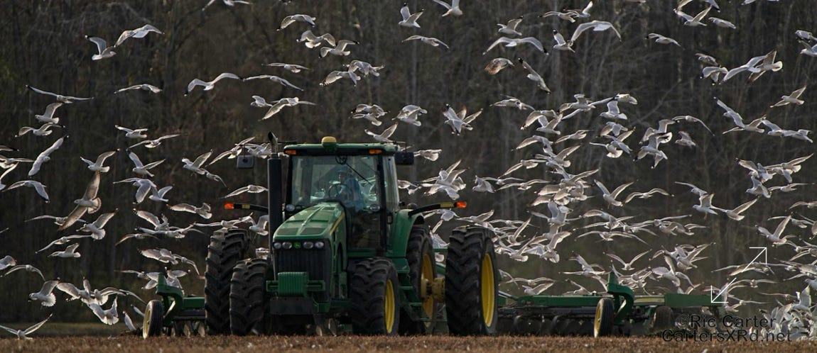 We usually think of seagulls and large bodies of water, but thousands hang out on our river at night. They then disperse into the farmlands at the start of day. These ring-billed gulls frantically swarm a tractor tilling a field and grab at overwintering creatures in the soil being exposed to the late winter skies. I took these photos January 24, 2024.