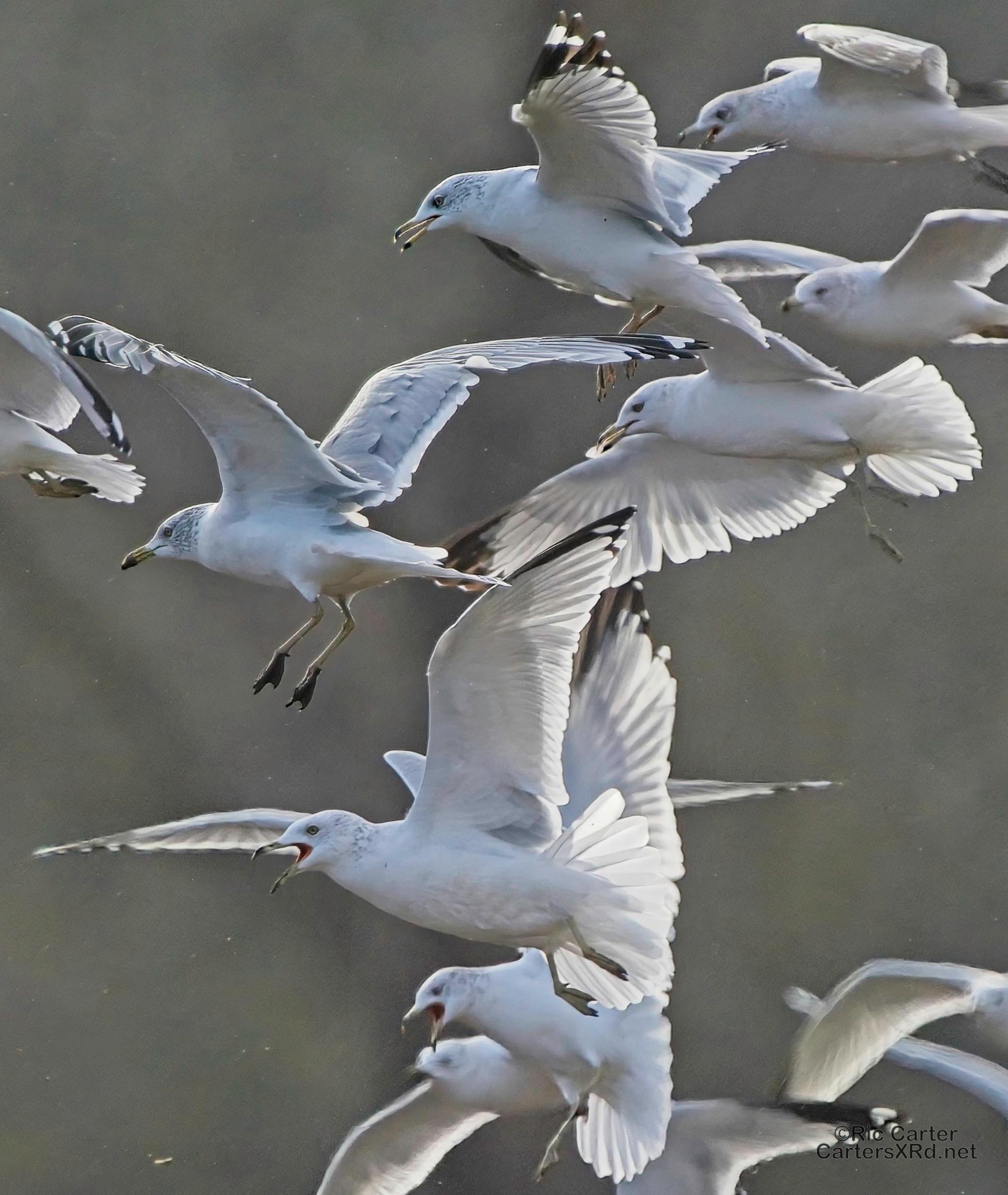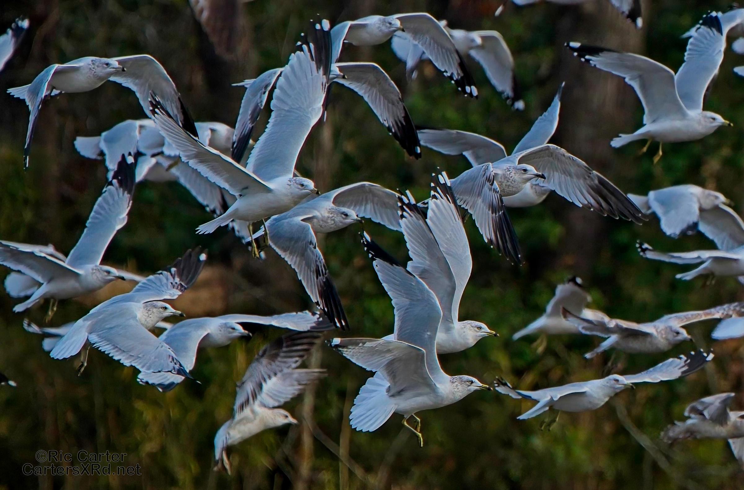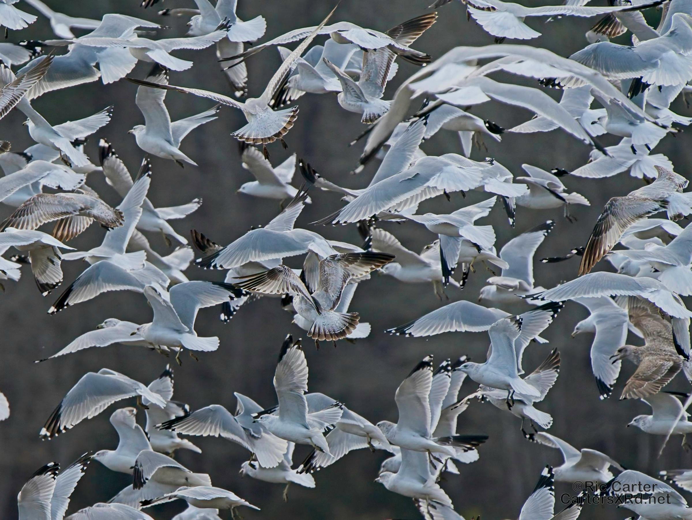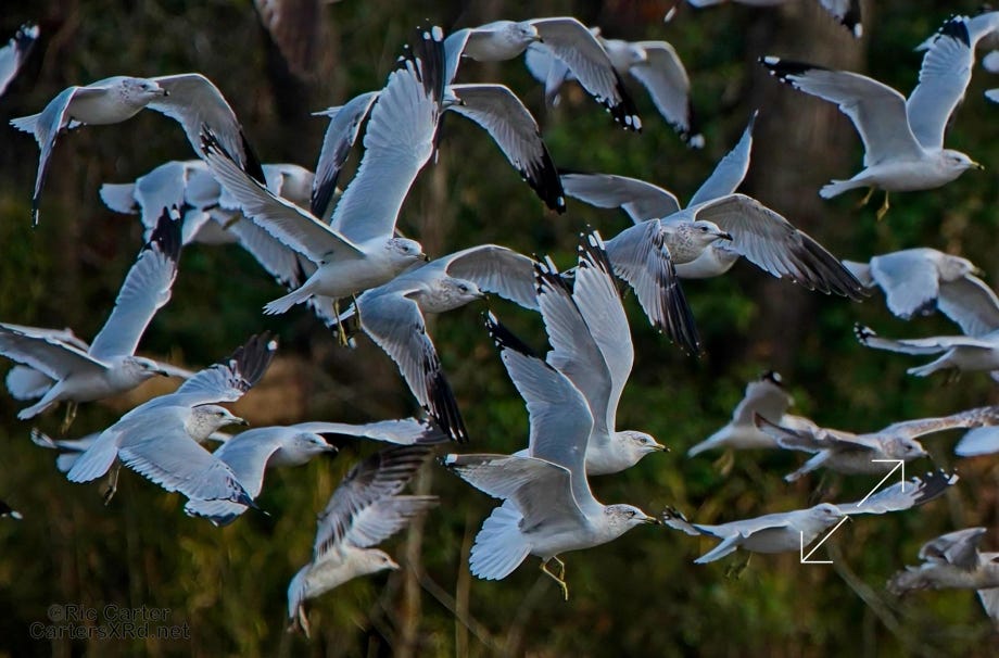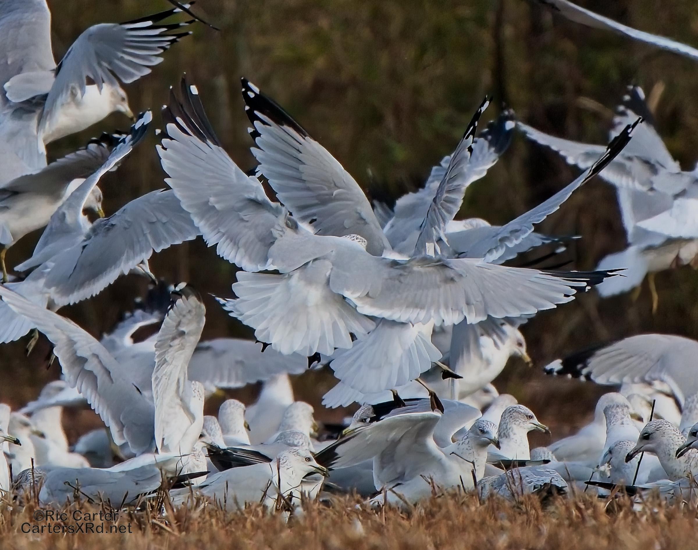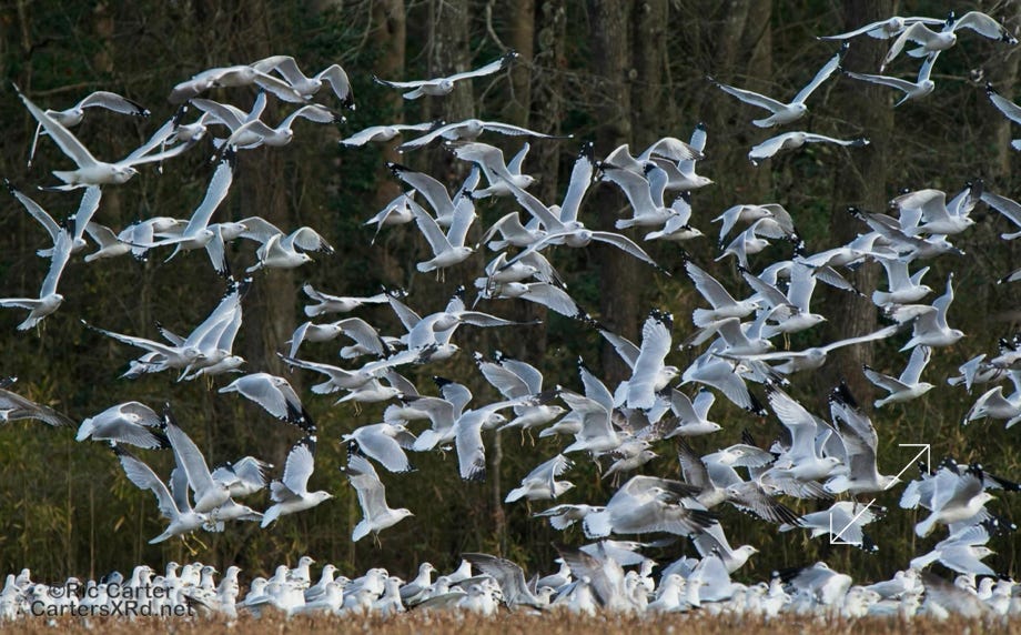 We usually think of seagulls and large bodies of water, but thousands hang out on our river at night. They then disperse into the farmlands at the start of day. These ring-billed gulls frantically swarm a tractor tilling a field and grab at overwintering creatures in the soil being exposed to the late winter skies. I took these photos January 24, 2024.