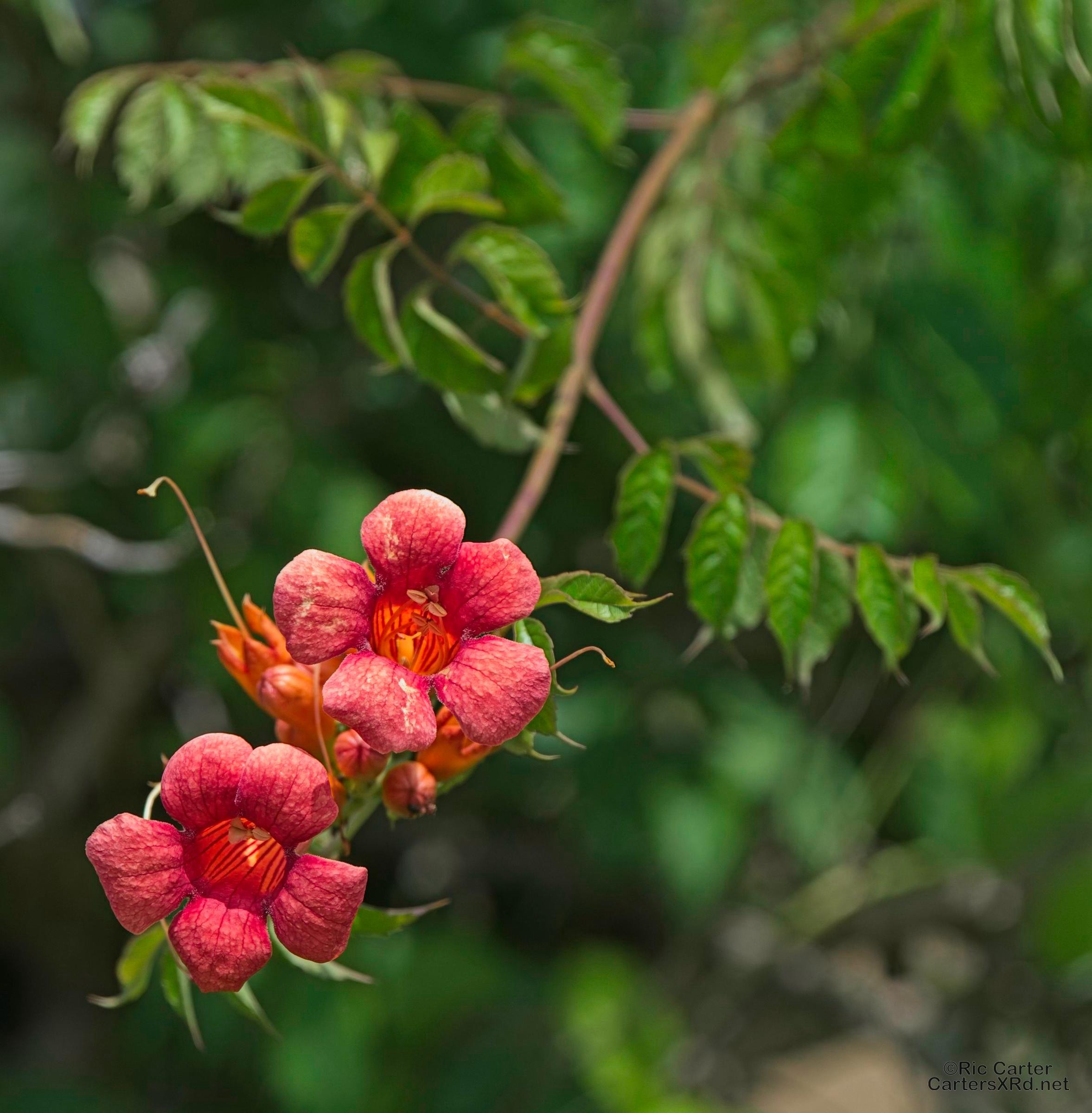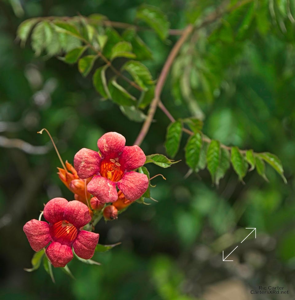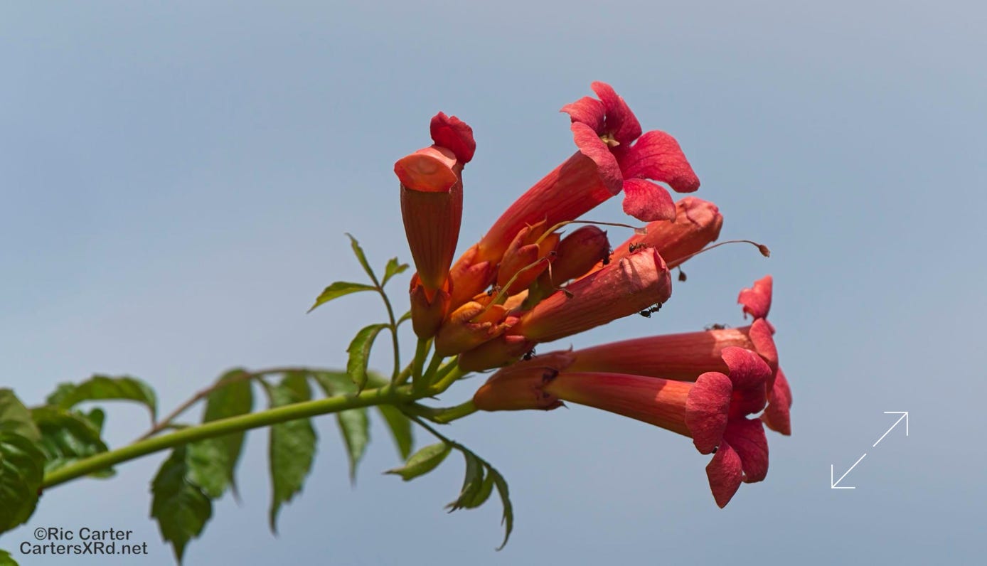 Trumpet vine is one of the most colorful features of out woods, but also gives a great invitation to hummingbirds.
