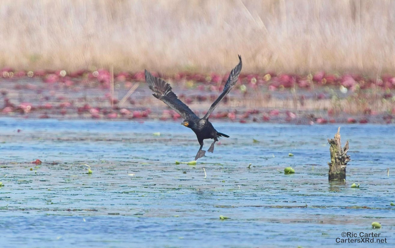 Double Crested Cormorants are better built for swimming than flying. One they are awing their form is pretty clean, but the getting in the air is a bit less so. Pungo Lake NC, April 2024.